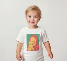 Una persona che indossa un vivace top arancione tiene vicino un elegante gatto nero, i loro sguardi sono allineati, evidenziando il forte legame tra l'uomo e l'animale domestico su uno sfondo semplice e dai toni caldi.