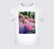 Un prato è pieno di alte guglie di fiori di lupino rosa e viola, le cui forme morbide e verticali creano un paesaggio romantico e sognante che sembra rigoglioso e pieno di vita.