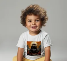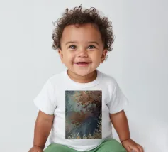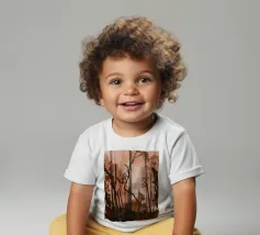 Il dipinto digitale di una foresta autunnale presenta sagome scure di alberi su uno sfondo caldo e dorato. L'opera d'arte testurizzata mostra un fogliame dettagliato nei toni dell'arancione e del marrone, creando una scena di bosco serena e suggestiva.
