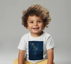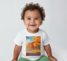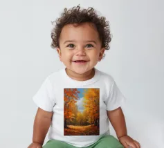 Una splendida rappresentazione astratta di una foresta autunnale con alti tronchi scuri e fogliame dorato. Lo sfondo caldo e luminoso esalta la composizione geometrica, creando un'atmosfera serena e moderna.