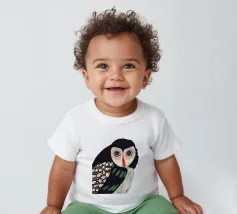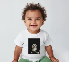 Un dipinto a olio di un gufo dall'aspetto simpatico e divertente. Si tratta di un uccello marrone chiaro con grandi occhi arancioni. Gli occhi del gufo sono un po' irregolari, il che lo fa sembrare ancora più buffo e dolce. Sembra anche un po' spaventato con i suoi occhi rotondi.