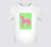 Questa giocosa illustrazione mostra un unicorno rosa con puntini su uno sfondo arancione e verde, perfetto per le camere dei bambini o per le decorazioni estive. La grafica dipinta a mano combina elementi fantasiosi con un design minimalista e crea un'atmosfera allegra che irradia gioia e creatività.