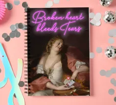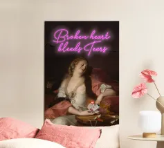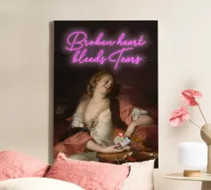 "Broken Heart" è un fantastico collage che satireggia le relazioni romantiche attraverso i social media. L'opera offre una critica ironica dei comportamenti della società contemporanea, il tutto mescolato con uno stile rinascimentale recuperato da dipinti iconici dell'epoca. In quest'opera, elementi classici si intrecciano con simboli contemporanei per illustrare la fragilità e la complessità delle relazioni nell'era digitale".