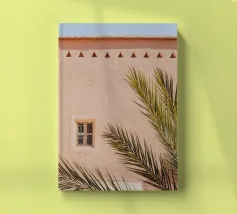 Palma, muro e finestra in Marocco. Edificio marocchino in argilla con foglie di palma.