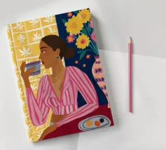 Una composizione astratta minimalista e moderna, caratterizzata da forme fluide e organiche in una tavolozza audace ed equilibrata di arancione, blu e giallo, che crea un senso dinamico di movimento.