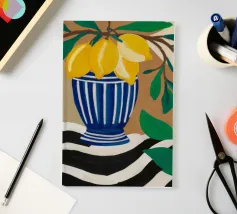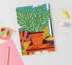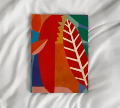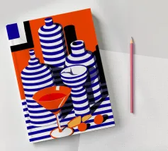 Una natura morta astratta e altamente stilizzata che presenta una bevanda in un bicchiere di vimini con una cannuccia blu. La scena è ambientata su una superficie con audaci motivi rossi e gialli, su uno sfondo verde strutturato.