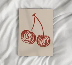 Un'illustrazione di ciliegie dolce ed elegante con un'atmosfera da coquette giocosa, su uno sfondo a griglia rosa tenue. Questo affascinante disegno combina motivi di frutta vintage con un'estetica moderna, perfetta per aggiungere un tocco divertente e civettuolo a qualsiasi cucina, parete di galleria o spazio femminile.