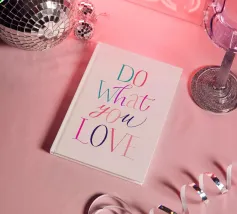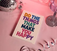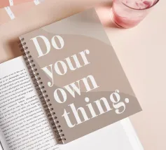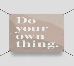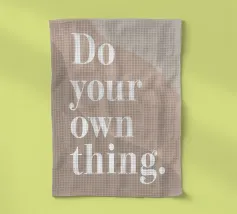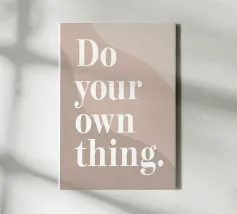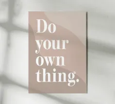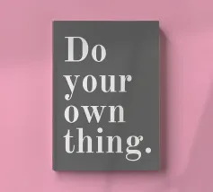 Una composizione vibrante ed edificante con una persona che cammina con sicurezza lungo un sentiero tortuoso e colorato che si separa da una strada trafficata e uniforme. La frase "Do Your Own Thing" (Fai la tua cosa) è stilizzata in una tipografia audace e dipinta a mano, circondata da spruzzi di colore. Le opere d'arte emanano individualità, libertà e autoespressione.