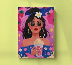 Questa opera d'arte raffigura una persona con un vivace top giallo a fiori e pantaloni blu, che assume una posa dinamica su uno sfondo rosa con motivi floreali arancioni.