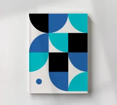 Dinamica stampa d'arte astratta geometrica in stile Bauhaus. Presenta un'accattivante composizione di semicerchi e quarti di cerchio neri e a righe, combinati con aree di colore azzurro, su uno sfondo chiaro. L'interazione di forme, motivi e blocchi di colore crea un'immagine di grande impatto. File artistico digitale di alta qualità (7000x5000px, 300 dpi) perfetto per stampe di grande effetto. Ideale come opera d'arte moderna da parete.