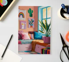 Vista dall'alto di un tavolo in una biblioteca, traboccante di pile di libri colorati e di un bellissimo bouquet di fiori. La scena è una celebrazione massimalista e gioiosa della conoscenza e della bellezza naturale.