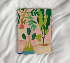 Una composizione giocosa di forme astratte e organiche nello stile di Maraoui, che utilizza una tavolozza calda di rosa, rosso e giallo su uno sfondo beige.