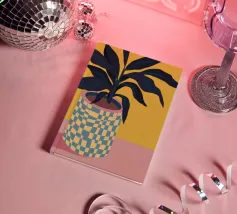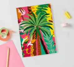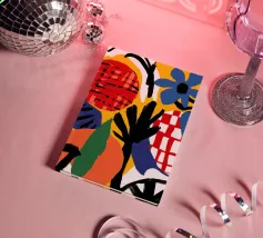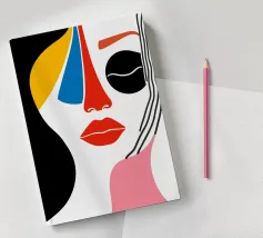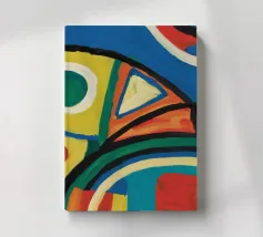 Il ritratto astratto di una donna nera ha un'espressione serena ed equilibrata, con le sue forme splendidamente integrate in uno sfondo di motivi e forme geometriche audaci e colorate.