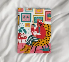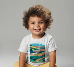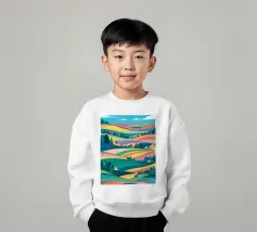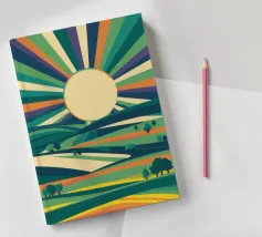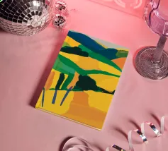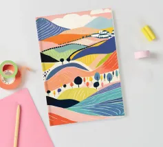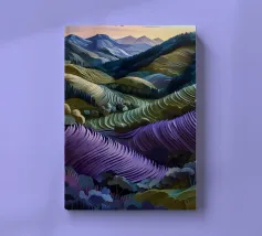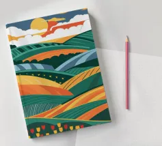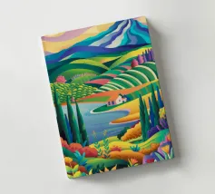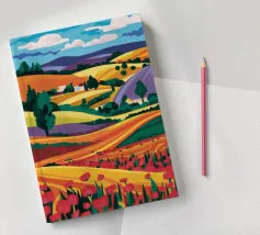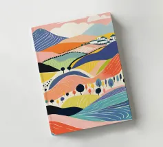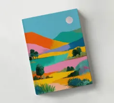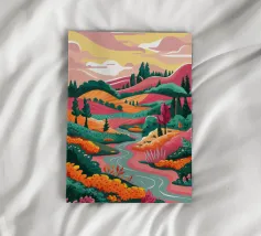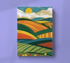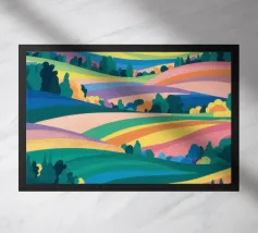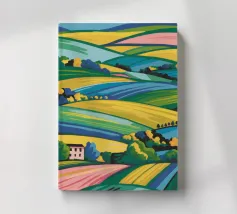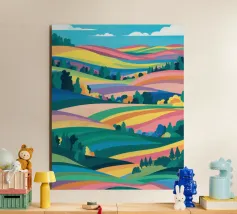 Un bellissimo paesaggio di dolci colline e campi, reso in un colorato patchwork di verdi, blu, rosa e gialli, che evoca un senso di campagna idilliaca.