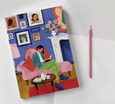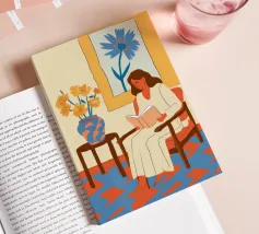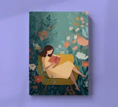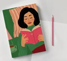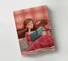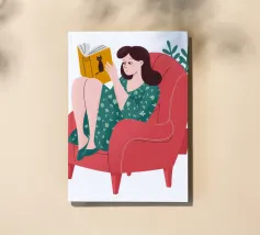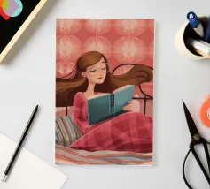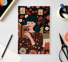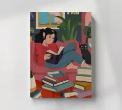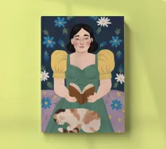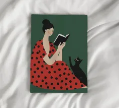 Illustrazione di una donna che legge un libro a letto, con un gatto che dorme pacificamente al suo fianco. La scena è un'immagine toccante, accogliente e serena di una compagnia perfetta e tranquilla.