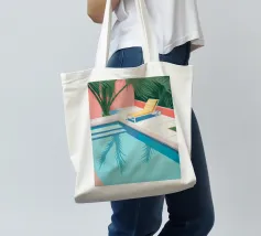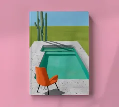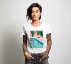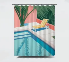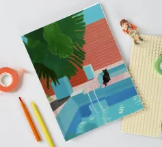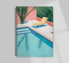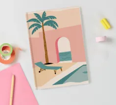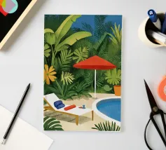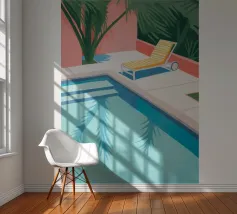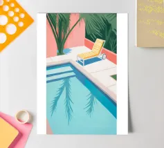 Immergetevi nell'idillio mediterraneo con questo dipinto digitale colorato, che mostra un giardino soleggiato con piscina e palme. Le morbide tonalità pastello di rosa, rosa, verde e azzurro invitano a rilassarsi e a sognare ad occhi aperti.