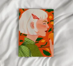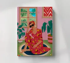 Il dipinto raffigura una persona con capelli corti e scuri acconciati a onde, che indossa un abito con motivi retrò e cerchi e diamanti nei toni del rosa, del marrone e del beige. Lo sfondo è di un semplice colore beige chiaro.