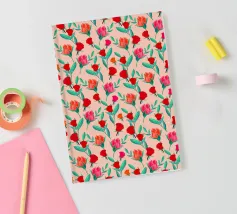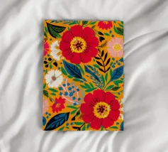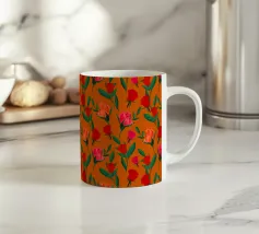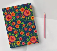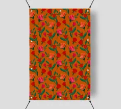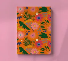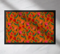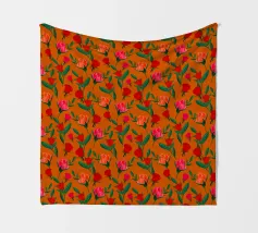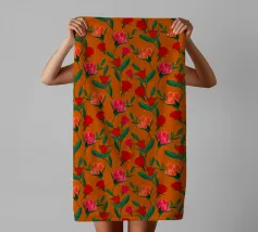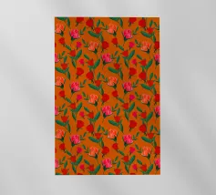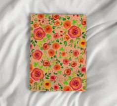 Elegante stampa floreale boho chic con vivaci fiori di rosa rossi, arancioni e rosa con steli e foglie verdi, su uno sfondo arancione bruciato.