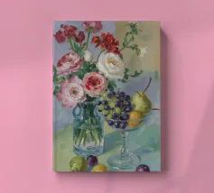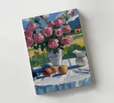 Un'audace natura morta con vivaci fiori rosso-rosa, forse papaveri o gerani, in un semplice vaso, accanto a fresche pere verdi, il tutto su una ricca tovaglia rossa che contrasta nettamente con uno sfondo blu intenso.