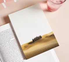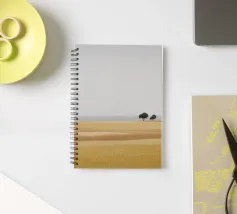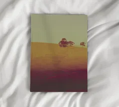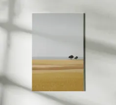 Opera d'arte minimalista che raffigura un vasto campo dorato che si estende all'orizzonte con un oceano calmo e un paio di alberi lontani sotto un cielo morbido e limpido. Ideale per un'atmosfera tranquilla ed espansiva.