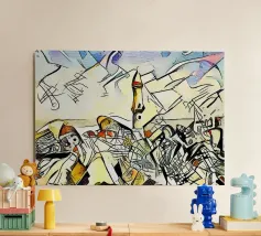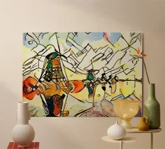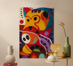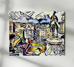 Questo dipinto astratto vibrante ed energico presenta un gioco dinamico di forme frammentate e linee audaci, con una ricca tavolozza di arancioni, gialli, viola e blu. La composizione suggerisce elementi decostruiti, forse figure o oggetti, in un movimento vorticoso ed energico, caratteristico delle influenze cubiste ed espressioniste astratte. I dettagli intricati e i colori contrastanti creano un'esperienza visiva accattivante e stimolante. Questo poster digitale di alta qualità (7000x5000 pixel, 300 dpi) cattura magnificamente l'energia grezza e il genio artistico dell'originale, ma