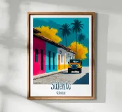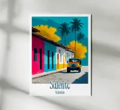 Il Salento, il cuore colorato della regione colombiana produttrice di caffè, è qui immortalato con le sue case luminose, le palme slanciate e le famose jeep Willys. Un manifesto pieno di vita e di autenticità andina.