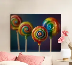 Un vivace mix di caramelle è distribuito su una superficie rosa, che mostra varie forme e colori, tra cui lecca-lecca roteanti e dolciumi rotondi. Questa disposizione giocosa invita a una gioiosa indulgenza.