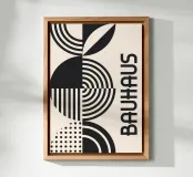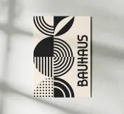 Un sofisticato poster astratto in bianco e nero che incarna i principi fondamentali del design geometrico Bauhaus. La composizione presenta una disposizione verticale di quadranti modulari, ciascuno contenente diversi motivi geometrici: cerchi concentrici, strisce verticali, motivi a punti e una forma organica stilizzata di foglia. Il gioco di nero pieno, strisce e punti crea una texture visiva dinamica. La parola "BAUHAUS" scorre verticalmente lungo il lato destro in un carattere sans-serif pulito e arrotondato. Questa opera d'arte è una pura celebrazione di forma e funzione. Questo download digitale ad alta risoluzione (7000x5000
