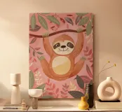 Bradipo appeso a un ramo in un ambiente tropicale con colore pannello forex