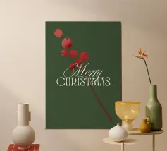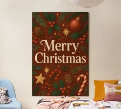 Una calda ed elegante illustrazione natalizia con vibranti stelle di Natale, rami di pino, bacche e stelle dorate che circondano un messaggio senza tempo di "Buon Natale". I ricchi rossi e i verdi intensi creano un'atmosfera classica e festosa, perfetta per interni accoglienti, angoli regalo e decorazioni stagionali.