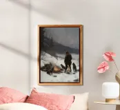 Cacciatore d'inverno al fuoco - Cacciatore con cani Stampa d'arte pannello forex