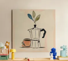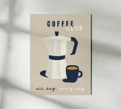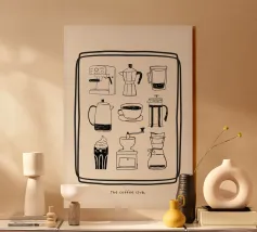 Black and white illustration with moka pot, beans and "Caffè?" lettering. Clean design with a retro touch, perfect for coffee lovers and modern kitchen walls.