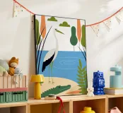 Scoprite la bellezza della natura con un tocco di umorismo in questa opera d'arte con una cicogna e un coccodrillo come amici. I colori vivaci e i disegni unici creano un'atmosfera fresca e divertente.