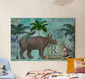 Collage fantasioso con rinoceronte, pavone, palma, scimmia e altri elementi vintage