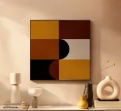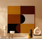 Questo pezzo di ispirazione Bauhaus unisce le calde tonalità del marrone e del senape con audaci forme geometriche per un'accogliente atmosfera da metà del secolo scorso. Perfetto per aggiungere un tocco di fascino retrò e di equilibrio moderno a qualsiasi spazio.
