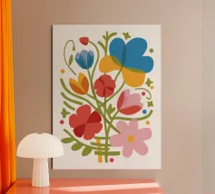 Questo vivace disegno floreale combina colori vivaci e forme moderne: Fiori rossi e blu con un centro giallo solare su un allegro sfondo rosa e giallo. Un motivo fresco ed elegante che unisce il fascino retrò degli anni '70 alla chiarezza scandinava. Perfetto come murale, tazza, cuscino o cover per cellulare, per gli amanti dei motivi floreali colorati, delle decorazioni di metà secolo e degli accessori moderni per la casa. Un richiamo ideale per il soggiorno, la camera da letto o l'ufficio e un regalo affascinante per gli amanti dell'arte e dei fiori.