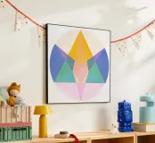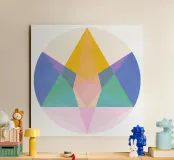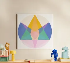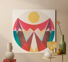 rCaratterizzata da una composizione equilibrata di triangoli appuntiti, cerchi morbidi e linee che si intersecano, questa stampa utilizza una tavolozza audace e curata per creare un punto focale che è allo stesso tempo calmante ed energizzante. Perfetta per un ufficio moderno, un soggiorno minimalista o uno studio di yoga contemporaneo.