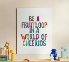 Celebrate l'individualità con la nostra vivace stampa tipografica "Be a Fruitloop in a World of Cheerios". Questo messaggio giocoso prende vita con una splendida scritta dipinta a mano in acquerello arcobaleno, che contrasta splendidamente con uno sfondo bianco. Perfetto per le camere dei bambini, le camerette o qualsiasi altro spazio che necessiti di un tocco di colore e positività, questo allegro disegno incoraggia ad abbracciare l'unicità. Lo stile artistico e stravagante si rivolge sia ai bambini che agli adulti, rendendolo un'aggiunta versatile a qualsiasi casa. Lasciate che questa stampa ispiratrice illumini il vostro spazio e ispiri fiducia!