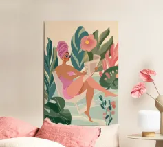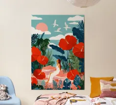 Tra imponenti papaveri corallini e palme piumate, una donna si sdraia pacificamente sotto un audace sole rosso, galleggiando su una pozza di quiete. Uccelli bianchi si librano in un cielo da sogno, facendo eco all'immobilità della sua posa. La scena, sullo sfondo di ricche montagne indaco e di un cielo color mandarino, cattura un'armonia surreale tra la natura e il sé, un momento sospeso in cui il tempo fiorisce e il pensiero si dissolve nel colore e nella calma.