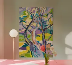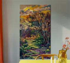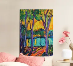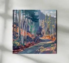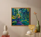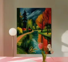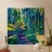 An expressive, painterly landscape of a path alongside a stream flowing through a forest. The vibrant blues, greens, and yellows create a dynamic, beautiful, and slightly abstract depiction of a walk in nature.
