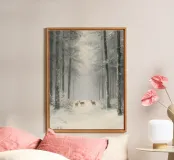 Questo suggestivo motivo invernale mostra una foresta innevata con alberi ad alto fusto, al centro della quale un piccolo gruppo di cervi si sofferma pacificamente. La leggera foschia conferisce alla scena un'atmosfera fiabesca e tranquilla che irradia calma e contemplazione. Perfetto per biglietti d'auguri natalizi, poster, calendari o come decorazione murale per la stagione invernale. Questa immagine trasmette la bellezza e la magia della natura in inverno.