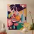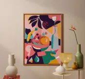 Una natura morta astratta giocosa e colorata con forme decostruite che rappresentano frutta, foglie e vasi. La composizione energica e la tavolozza vivace creano un'interpretazione gioiosa e moderna di un tema classico.