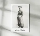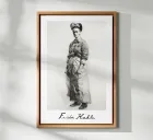 Graphic hand drawing of Frida Kahlo: This detailed digital drawing shows Frida Kahlo in a powerful, standing posture that radiates strength and determination. The shading and fine strokes give the image depth and dimension. Frida's signature is stylishly integrated.