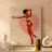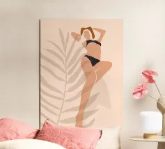 Un'elegante illustrazione minimalista di una donna in bikini giallo, sdraiata su un galleggiante rosa in un ambiente tropicale. I toni caldi e solari e l'estetica retrò evocano un senso di relax e beatitudine estiva. Perfetto per aggiungere un tocco di atmosfera vacanziera a qualsiasi spazio.