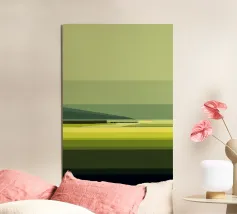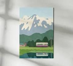 Un'illustrazione digitale minimalista con un elegante treno bianco che attraversa un ampio paesaggio verde dalla trama morbida. La composizione enfatizza il movimento orizzontale e l'ampio spazio negativo per evocare un viaggio sereno attraverso una campagna tranquilla.