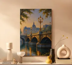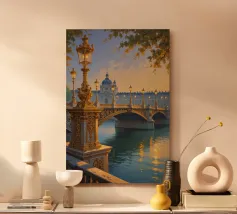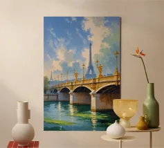 Un magnifico dipinto impressionista che mostra la Torre Eiffel sullo sfondo, incorniciata dall'ornato ponte dorato che attraversa la Senna. Le calme acque sottostanti riflettono gli intricati dettagli dei lampioni e delle sculture dorate. Il cielo azzurro, punteggiato da soffici nuvole, crea un'atmosfera parigina serena e incantevole. La luce dorata esalta il fascino senza tempo del ponte, fondendosi magnificamente con la silhouette iconica della Torre Eiffel. Una celebrazione dell'eleganza architettonica e della bellezza naturale.