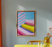 Illustrazione a guazzo di gradini gialli davanti a pareti a strisce rosa-blu-gialle. Sfondo minimalista, linee decise, forme geometriche e composizione chiara. Blocchi di colore vivaci in tonalità pastello di rosa, blu, giallo e bianco creano un'illustrazione astratta, vivace ed estetica.