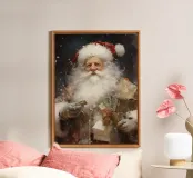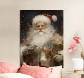 Un dipinto festivo pieno di magia natalizia: Babbo Natale con il suo sorriso raggiante porta tra le braccia regali amorevolmente incartati. La neve turbina nell'aria e conferisce alla scena un'atmosfera vivace e invernale. I colori caldi e i dettagli raffinati catturano magnificamente la gioia e la magia del periodo natalizio.