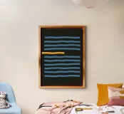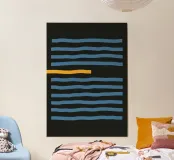 Scoprite questo accattivante poster astratto con una composizione audace e minimalista. Il disegno presenta linee orizzontali blu leggermente ondulate su uno sfondo nero opaco, evocando un senso di calma e struttura. La composizione è bruscamente interrotta da un'unica, vibrante barra giallo senape sulla sinistra, che crea un potente punto focale visivo e un contrasto dinamico. Questo pezzo incarna perfettamente la semplicità geometrica e la tavolozza di colori del design del Mid-Century Modern. Riceverete un file digitale premium da scaricare (7000x5000 pixel, 300 dpi) per una stampa di alta qualità che farà la felicità di tutti.