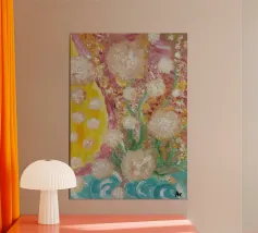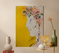 Questo dipinto su sfondo giallo pastello è morbido e rilassante. I fiori colorati contrastano con la semplicità del disegno, creando una sottile armonia.